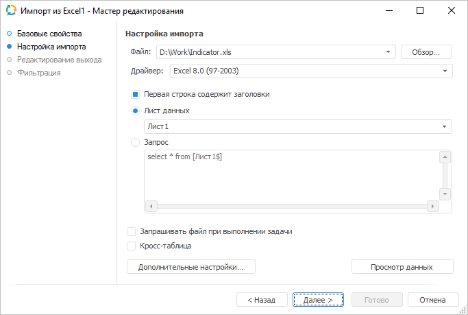Если установить флажок «Запрашивать файл при выполнении задачи», то при выполнении задачи ETL будет открыт диалог для выбора файла Microsoft Excel. По умолчанию флажок снят, при этом работа осуществляется с тем файлом, который указан в поле «Файл».