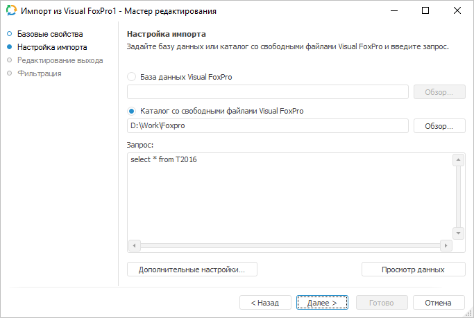Переключатели «База данных Visual FoxPro» и «Каталог со свободными файлами Visual FoxPro» определяют тип источника.