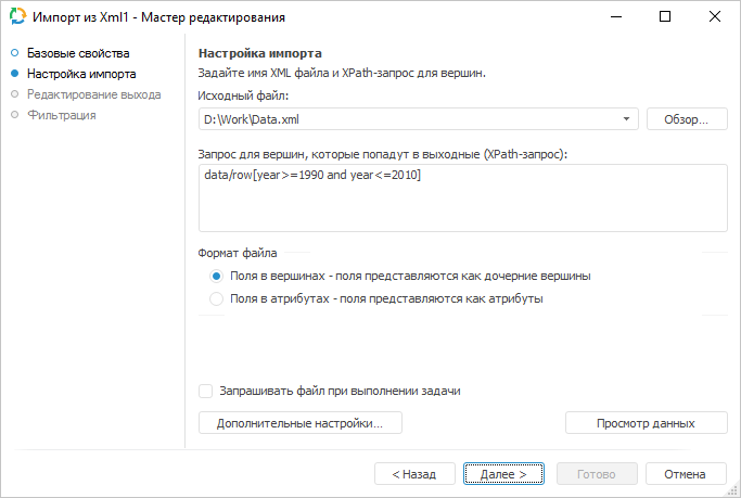 Если установить флажок «Запрашивать файл при выполнении задачи», то при выполнении задачи ETL будет открыт диалог для выбора XML-файла. По умолчанию флажок снят, при этом работа осуществляется с тем файлом, который указан в поле «Исходный файл».