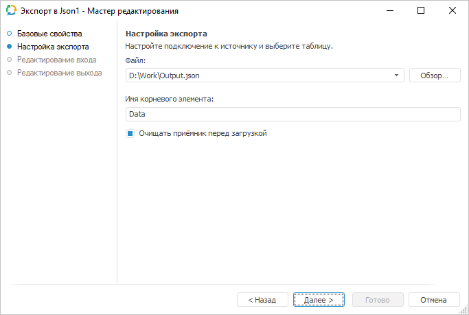 На странице «Настройка экспорта» указывается файл для экспорта данных.