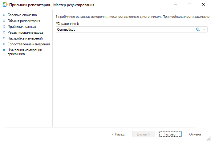 Для осуществления фиксации отметки измерений приёмника, которые не были сопоставлены с измерениями источника, используйте страницу «Фиксация измерений приёмника». Страница будет доступна, если в качестве приёмника выбран существующий куб или база данных временных рядов и на вкладке «Сопоставление измерений» была сброшена привязка хотя бы для одного измерения.