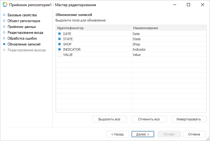 Для выбора полей для обновления в источнике и приёмнике данных используйте страницу «Обновление записей».