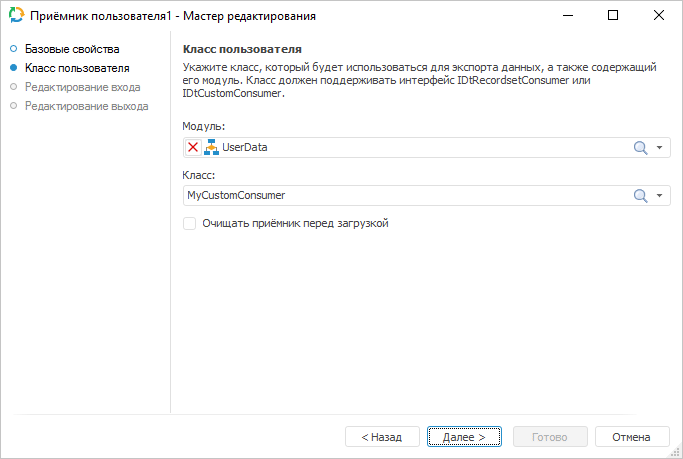 В раскрывающемся списке «Модуль» выберите модуль/форму/сборку, а в раскрывающемся списке «Класс» выберите класс, в котором содержится реализация пользовательского алгоритма получения данных. Класс должен быть унаследован и содержать реализацию интерфейса или IDtCustomConsumer.