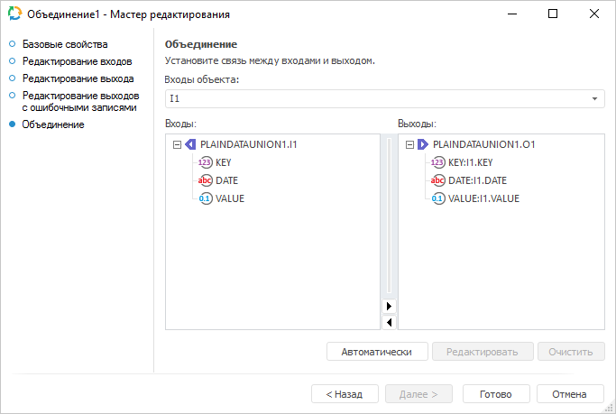 На странице «Объединение» устанавливается связь между полями входов и полями выхода.