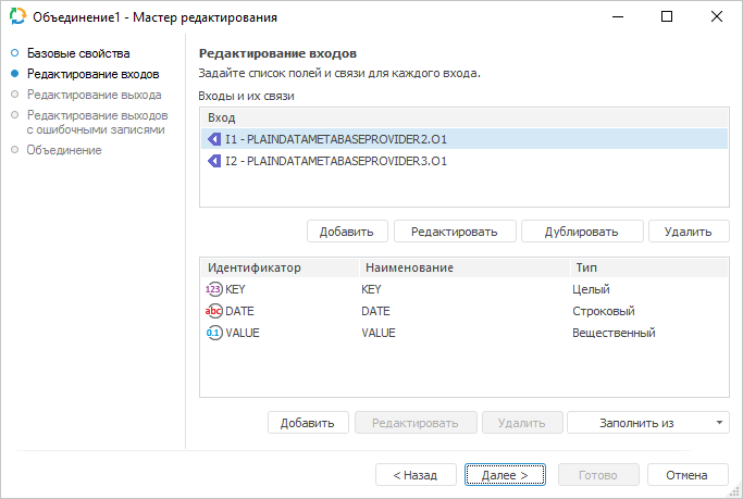 В разделе «Поля входов» содержится список полей и их параметров объекта-источника/объекта-приёмника: