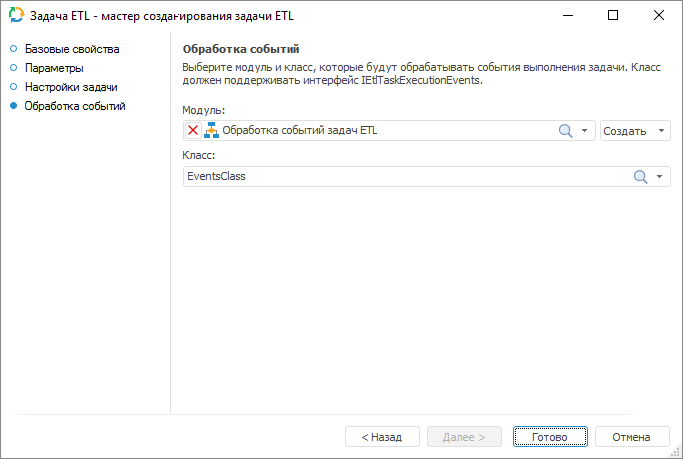 В раскрывающемся списке «Модуль» выберите объект среды разработки, а в списке «Класс» выберите класс, содержащий реализацию обработчиков событий задачи ETL. Список классов-обработчиков содержит все классы, унаследованные от класса EtlTaskExecutionEvents.