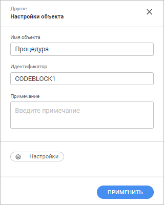 Примечание. Пример панели настроек приведен для объекта «Процедура».