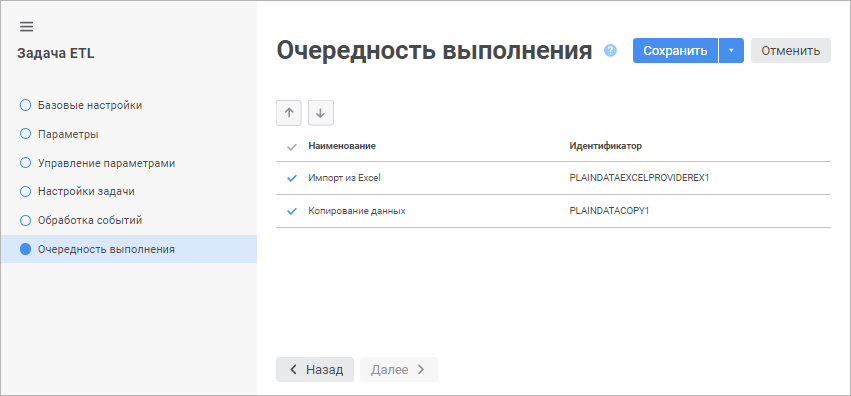 На странице «Очередность выполнения» в мастере редактирования задачи ETL задаются цепочки импорта/экспорта, которые будут выполнены/исключены при выполнении задачи ETL. Задача ETL может содержать несколько схем преобразования данных.