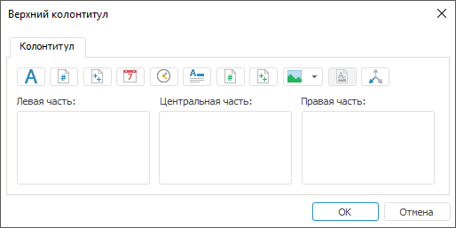 Область колонтитула условно разделена на три части, отличающиеся способом выравнивания содержимого: по левому краю, по центру или по правому краю. Каждая часть имеет свои собственные параметры.