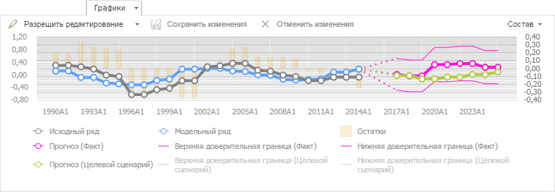 Количество и состав рядов, отображаемых на графике, зависит от того, какой объект выбран и используется ли сценарное моделирование. Дополнительную информацию об отображении графиков вы можете получить в разделе «Особенности отображения данных на графике».