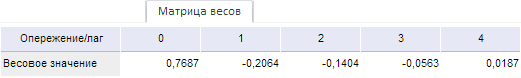 В столбцах расположены рассчитанные значения коэффициентов. Размерность матрицы: 1×(q+1), где q - значение параметра «Опережение/лаг», заданного на вкладке боковой панели «Уравнение».