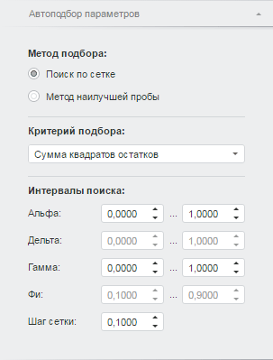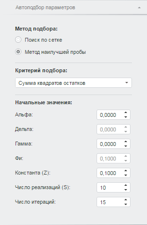 Для настройки параметров автоматического подбора значений коэффициентов в уравнении «Экспоненциальное сглаживание» используйте вкладку «Автоподбор параметров» на боковой панели.