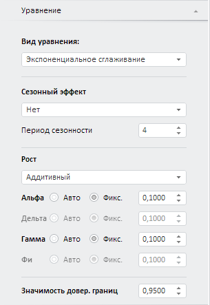 Период сезонности. Если выбран какой-либо сезонный эффект, то задайте длину периода сезонности. Значение по умолчанию - «4».