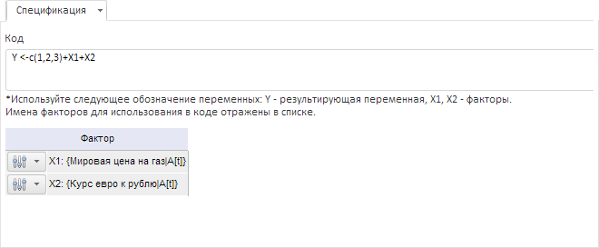 В поле «Код» сформируйте выражение для преобразования данных. В выражении можно использовать факторы. Каждому фактору сопоставлен элемент с идентификатором вида Xn, где n - номер по порядку.