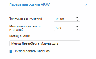 Примечание. Если для метода расчёта нельзя задать порядки авторегрессии и скользящего среднего, то настройка параметров оценки ARMA недоступна.