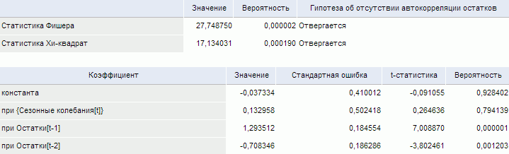 Для каждой статистики приведено: значение, вероятность статистики и результат теста: принимается или отвергается гипотеза об отсутствии автокорреляции остатков;