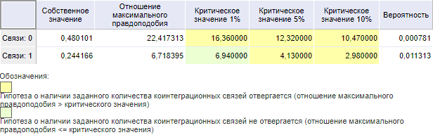 Тест выполняется одновременно для всех выделенных переменных. Для выявления коинтеграционных связей сравниваются значения отношения максимального правдоподобия с N процентным (= 1%, 5%, 10%) уровнем значимости. Если значение отношения максимального правдоподобия больше уровня значимости, то отвергается гипотеза о наличии коинтеграционных связей.