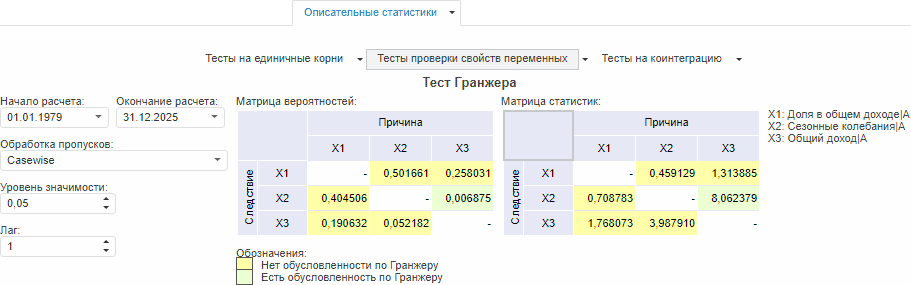 На вкладке содержатся параметры расчёта статистики и результаты расчёта.