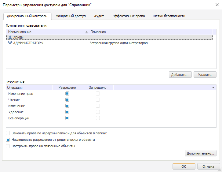 Установка и редактирование прав доступа осуществляется в окне «Параметры управления доступом», которое вызывается при выполнении команды контекстного меню «Права доступа» выбранного объекта: