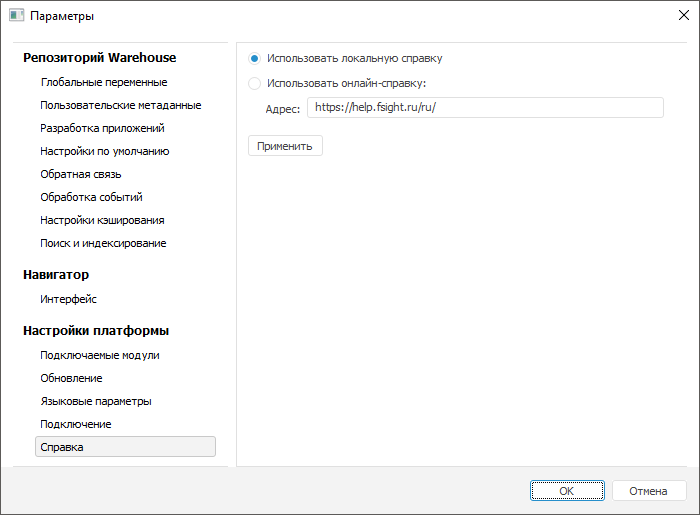 Примечание. При нажатии на кнопку «Применить» происходит проверка указанного адреса с действительным адресом справочной системы продукта «Форсайт. Аналитическая платформа». Если указанный адрес не соответствует, то тип справки не изменяется.