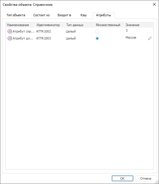 На вкладке «Атрибуты» содержатся атрибуты объекта, добавленные для классов объектов и типов объектов.