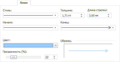 Длина стрелки. Укажите длину стрелки. Параметр применяется, если линия начинается/оканчивается стрелкой;