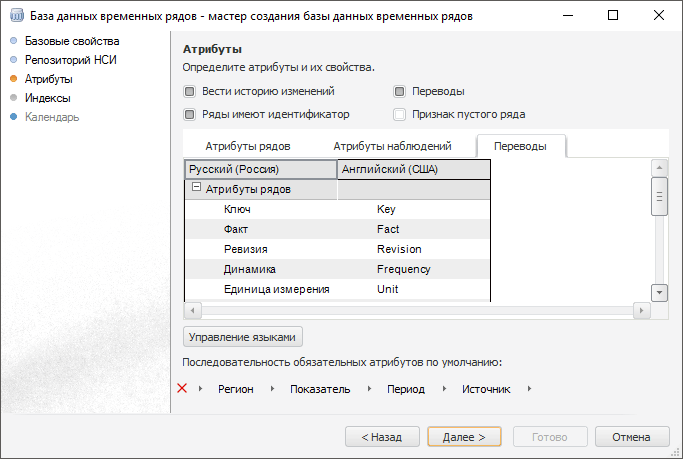 2. Откройте мастер создания базы данных временных рядов и перейдите на страницу «Атрибуты».