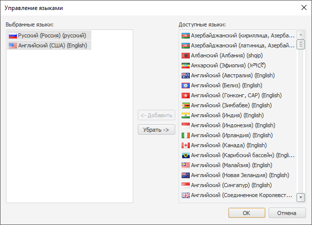 1. Добавьте новый язык перевода с помощью кнопки «Управление языками». Будет открыт диалог «Управление языками»: