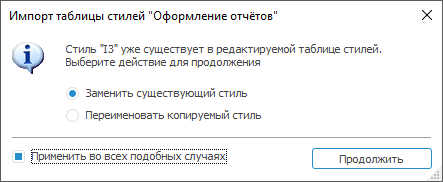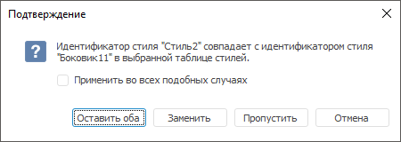 Если идентификатор импортируемого стиля совпадает с каким-либо из уже существующих в таблице стилей, будет отображён диалог: