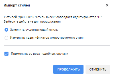 Для применения выбранного действия для всех импортируемых стилей, имеющих неуникальный идентификатор, установите флажок «Применить во всех подобных случаях». Если флажок снят, то диалог будет отображаться каждый раз при возникновении конфликтной ситуации.