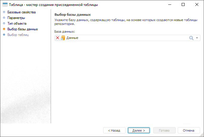 На странице «Свойства/Выбор базы данных» укажите базу данных, содержащую таблицы, на основе которых требуется создать новые присоединенные таблицы репозитория.