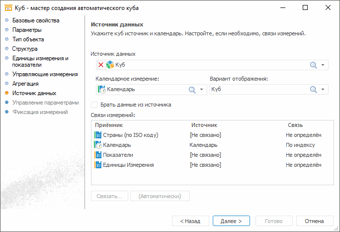 Источник данных. Позволяет выбрать источник данных для автокуба, возможны следующие варианты: