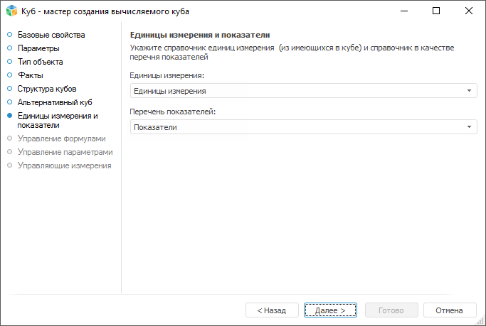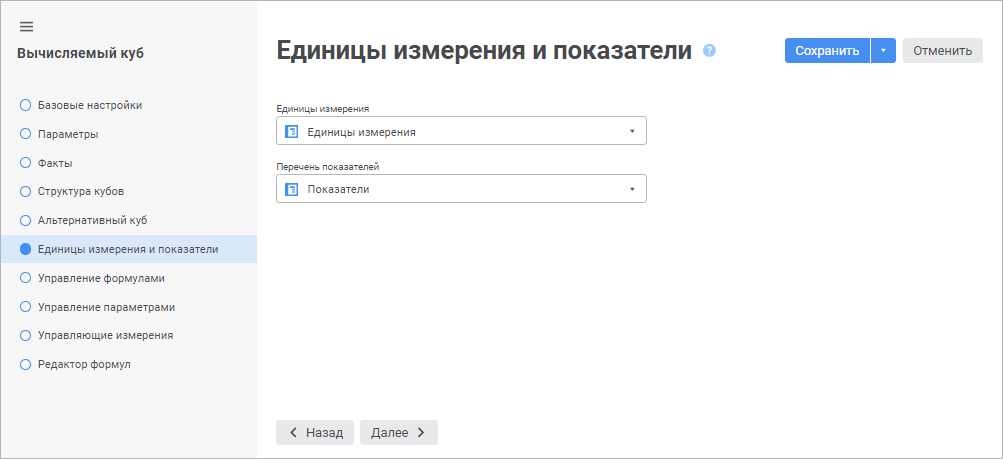 На странице «Единицы измерения и показатели» в случае необходимости указывается справочник единиц измерения и справочник в качестве перечня показателей. Указание данных справочников позволяет реализовать автоматический пересчёт единиц измерения.