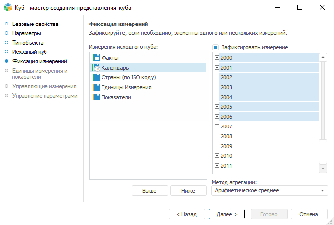 Представление-куб является способом отображения данных исходного куба путём фиксации одного или нескольких его измерений. Фиксация измерений заключается в выборе элемента, по которому будут извлекаться данные. При необходимости для фиксации измерения выделите несколько его элементов. В этом случае будет настроена агрегация данных по этим элементам.
