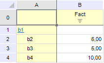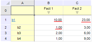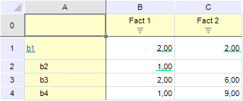 Рассчитанные значения подчеркнуты зеленым. Несмотря на то что значение для элемента b2 по Факт1 не изменилось после расчета, значение для данной координаты по Факт2 стало пустым, так как не было задано формулы для данного факта.