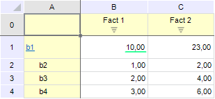 Для многомерного расчета в качестве источника и приёмника используется один и тот же куб. Данный куб состоит из рекурсивного измерения и содержит 2 факта. В редакторе формул многомерного расчета для координаты куба «b1(Факт1)» (подчеркнута зеленым) используется формула «b2(Факт1)». До расчета куб содержал следующие данные: