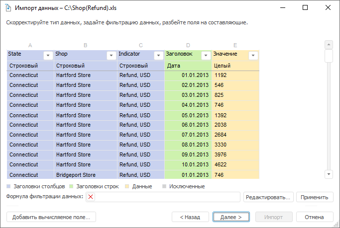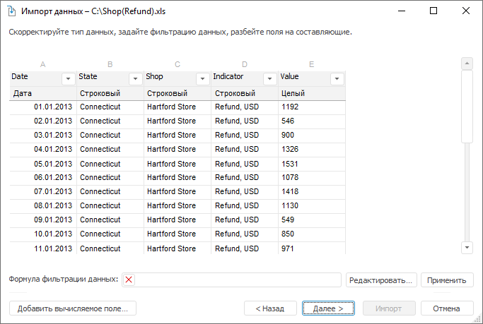Поля автоматически будут разбиты по измерениям, значения текстовых полей будут импортированы как значения атрибута «Наименование» элементов измерения. Все поля, имеющие вещественный тип данных, импортируются как значения. Для каждого поля со значением будет создан факт в измерении фактов.