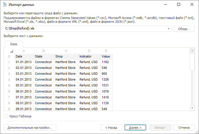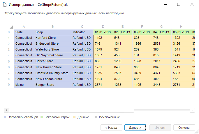 Рассмотрим пример импорта данных, представленных в виде кросс-таблицы. Кросс-таблица - это способ представления данных, при котором информация о различных показателях располагается в заголовках строк и столбцов, а на пересечении строк и столбцов располагаются фактические данные. В примере импорта использован файл Microsoft Excel, данные в котором расположены в следующем виде: