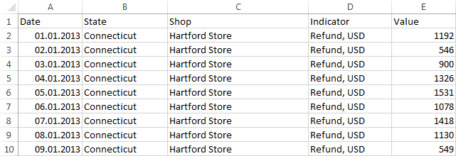 Рассмотрим пример импорта данных из файла Microsoft Excel в новый куб репозитория. В примере импорта использован файл, данные в котором расположены в следующем виде: