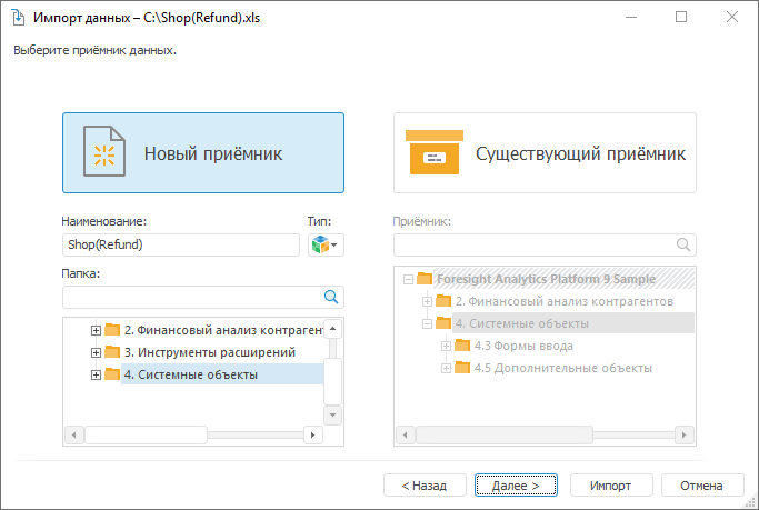 Нажмите кнопку «Новый приёмник», задайте наименование нового куба и выберите папку, в которой он будет сохранен в репозитории. Нажмите кнопку «Далее».