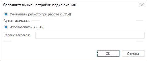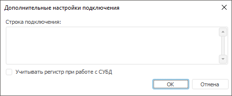 Окно с дополнительными настройками вызывается в настольном приложении при нажатии соответствующей кнопки на странице «Свойства базы данных». В зависимости от типа СУБД набор дополнительных параметров будет разный.