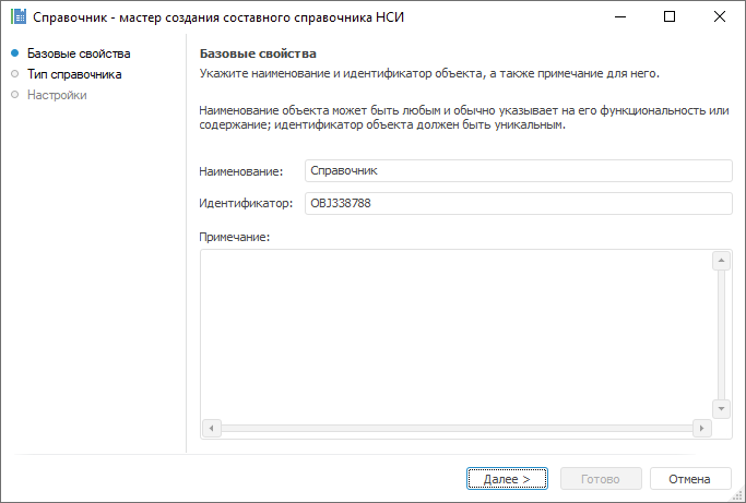 На странице «Базовые свойства» задаются наименование справочника, идентификатор и примечание: