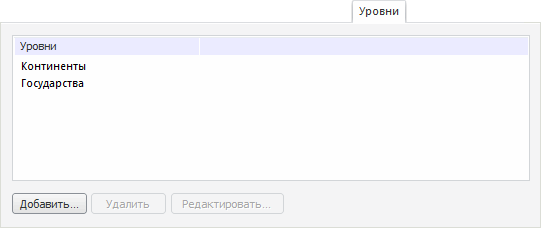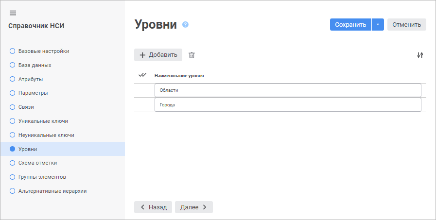 Для создания и настройки уровней справочника используйте страницу «Уровни» мастера настройки структуры справочника: