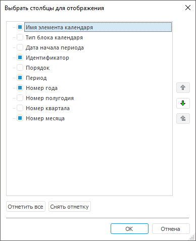 Выбор столбцов для отображения осуществляется посредством установки/снятия соответствующих флажков либо с помощью кнопок «Отметить все», «Снять отметку».