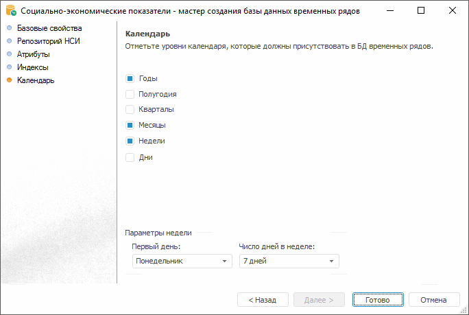 Флажками отметьте все уровни календаря, которые должны присутствовать в базе данных временных рядов. Если отмечен уровень «Недели», то доступны дополнительные параметры: