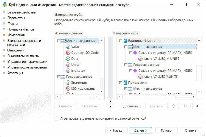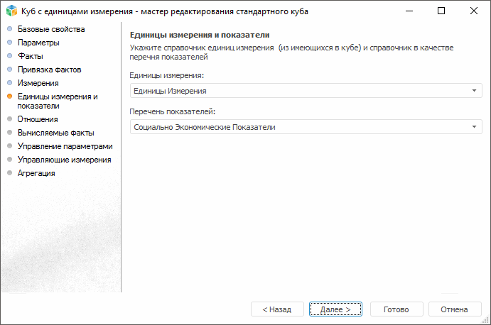 Настройка единиц измерения и перечня показателей в кубе