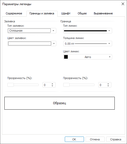 Для настройки границ и заливки общей легенды перейдите на вкладку «Границы и заливка» окна «Параметры легенды».