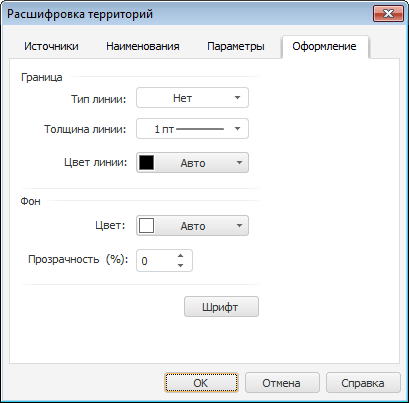 Для настройки оформления расшифровки территорий используйте вкладку «Оформление» в диалоге «Расшифровка территорий».