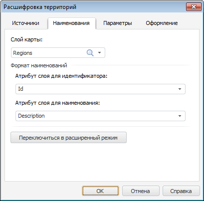 В расширенном режиме вкладка «Наименования» окна «Расшифровка территорий» выглядит следующим образом: