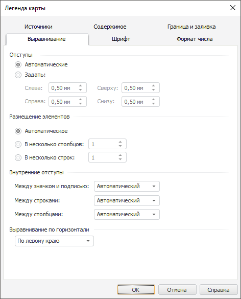 Для настройки выравнивания содержимого легенды перейдите на вкладку «Выравнивание» окна «Легенда карты»: